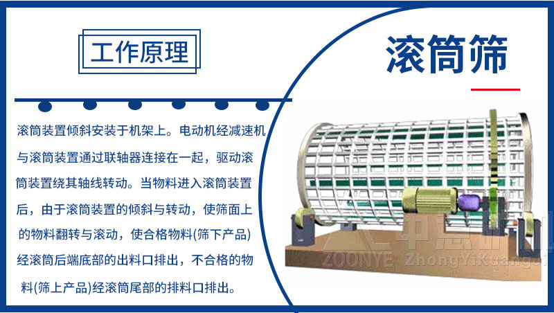 滾筒篩砂機、滾筒篩分機與滾筒篩的原理構(gòu)造幾乎相同,是人們對它的認(rèn)識和叫法上存在差異。由于物料在滾筒內(nèi)的翻轉(zhuǎn)、滾動,使卡在篩孔中的物料可被彈出,防止篩孔堵塞。滾筒篩主要由電機、減速機、滾筒裝置、機架、密封蓋、進(jìn)出料口組成。滾筒裝置傾斜安裝于機架上。電動機經(jīng)減速機與滾筒裝置通過聯(lián)軸器連接在一起,驅(qū)動滾筒裝置繞其軸線轉(zhuǎn)動。當(dāng)物料進(jìn)入滾筒裝置后,由于滾筒裝置的傾斜與轉(zhuǎn)動,使篩面上的物料翻轉(zhuǎn)與滾動,使合格物料(篩下產(chǎn)品)經(jīng)滾筒外圓的篩網(wǎng)排出,不合格的物料(篩上產(chǎn)品)經(jīng)滾筒末端排出。由于物料在滾筒內(nèi)的翻轉(zhuǎn)、滾動,使卡在篩孔中的物料可被彈出,防止篩孔堵塞。
